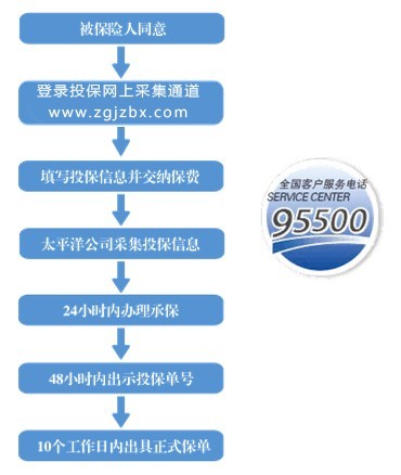 致电95500向太平洋保险投保→准备齐备理赔申请材料→交太平洋保险服务人员→太平洋保险理赔部门→受理立案→理赔审核与调查→结案→通知给付被保险人。