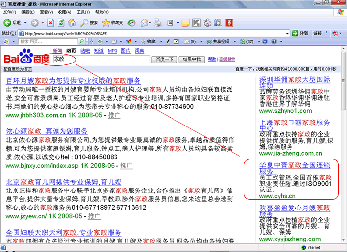 为进一步提升华夏中青家政全国连锁服务网站访问量,方便客户查询到服务提供机构,我们在全球最大中文搜索网--百度网(