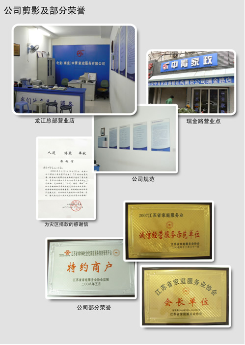 南京中青家政服务有限公司于2006年3月注册成立,系北京华夏中青家政公司在南京的连锁公司,是江苏省家庭服务业协会会长单位,南京市市容委清洗协会会员单位,中国联通南京公司10198服务平台指定家政服务单位。