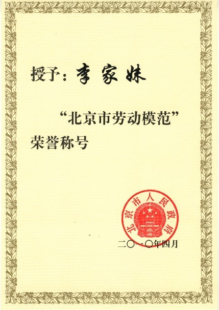 2010年4月20日,北京市隆重召开了劳动模范和先进工作者表彰大会。会上,1241名北京市劳动模范和先进工作者,191个市级模范集体受到表彰。华夏中青第二十分公司家政服务员李家妹荣获此荣誉。
