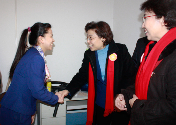 2012年1月16日下午,国家商务部部长助理仇鸿,北京市副市长程红在商务部服贸司和北京市商务委及北京家协等有关负责同志的陪同下,来到了北京华夏中青家政服务有限公司分钟寺直营店慰问一线的家政服务员和管理人员。领导们兴致勃勃的视察了店面的办公环境,观看了OA自动化办公系统和家政职业责任保险在线运行系统。然后到母婴护理提高班教室与30多位家政员亲切交谈,部长助理仇鸿赞赏提高班的家政员春节期间仍坚守岗位为首都市民提供服务,并亲切地询问大家有何要求。家政员成宝梅道出了大家共同的心声:“真想回家过年,但客户家离不开,我们就得留下来,我们也是拿了工资的,留下来给客户服务也是应该的”,领导们对此表示赞赏。家政员朱小琴、杨贵生也表达了一个心愿:“我们最大的希望就是客户能平等的对待我们,让我们更有尊严”。两位领导分别对家政员发表了热情洋溢的讲话,使在场的姐妹们无比激动,倍受鼓舞,教室里不时发出阵阵热烈的掌声。