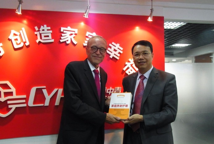 临别时,庞大春董事长向约翰先生赠送了由华夏中青组织研发,由中国工人出版社和中央电大出版社分别出版的“家庭养老护理”系列教材。约翰先生欣然接受。