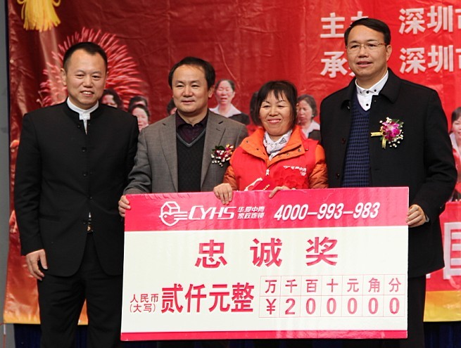 共同为家政员颁发忠诚奖(左一 深圳公司董事长徐用才、左二深圳报业副总编丁时照、右一北京连锁总部董事长庞大春)