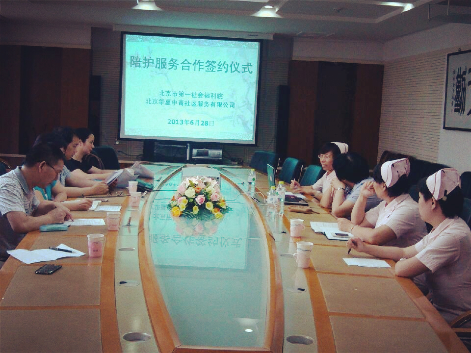 2013年6月28日下午,北京市第一社会福利院和北京华夏中青社区服务有限公司的有关领导在该院医疗部会议室举行了关于“陪护服务合作”的签约仪式。