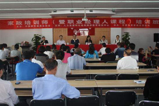 此次培训班由中国家庭服务业协会主办、人力资源与社会保障部教培中心协办、华夏中青连锁管理总部培训基地承办,出席典礼的领导有:中国家庭服务业协会张文范会长、中国家庭服务业协会庞大春监事长、人力资源与社会保障部教培中心秦瑞芳处长、华夏中青连锁管理总部运营总监张彤、培训研发总监杨琳、行政总监赵铁城等。