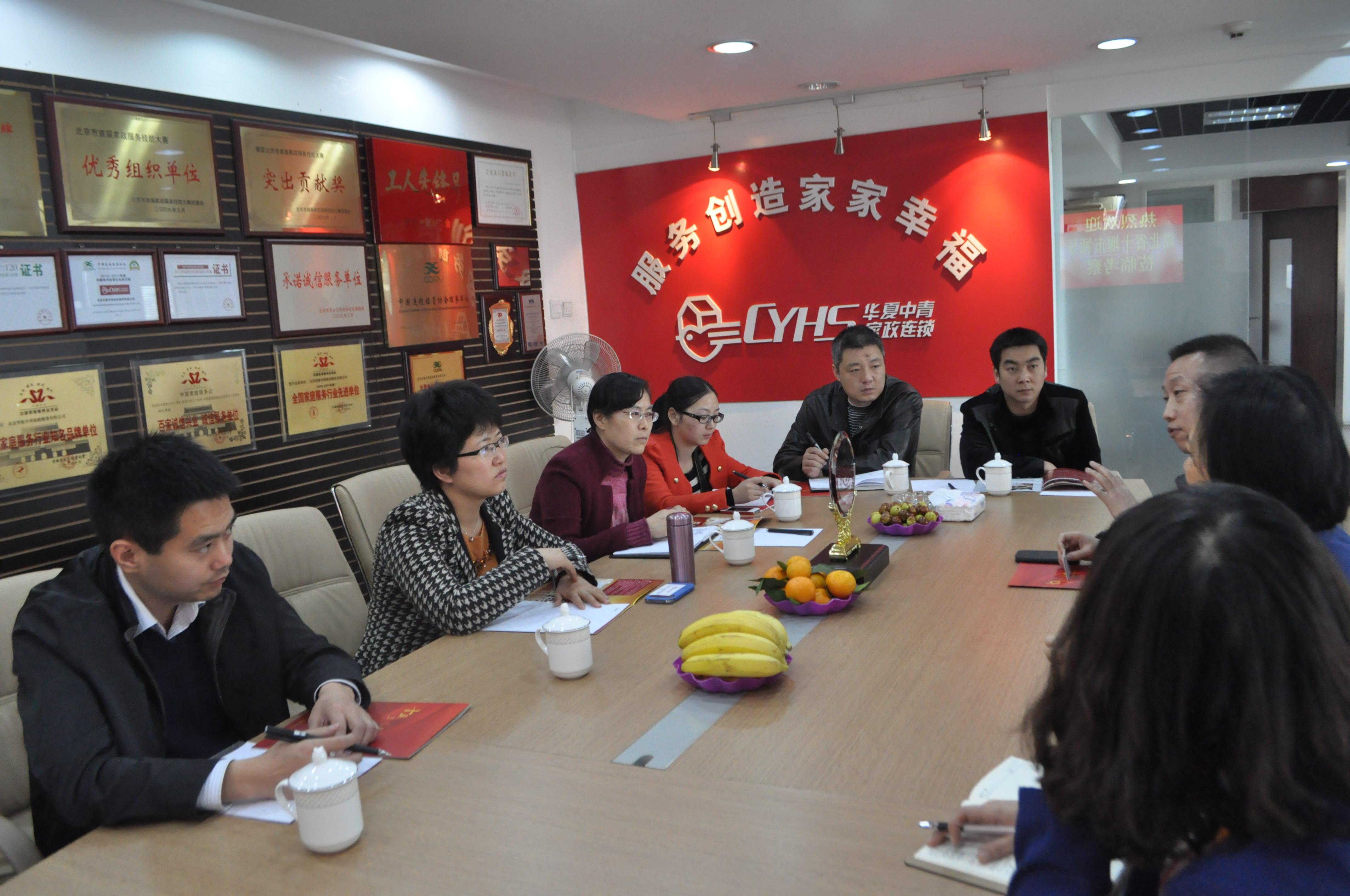 2013年11月6日上午,湖北省十堰市茅箭区区长周庆荣率考察团对华夏中青连锁管理总部进行考察,并与华夏中青总部赵铁城总监等有关负责人就开展家政培训、人员输转、养老等进行交流座谈。
