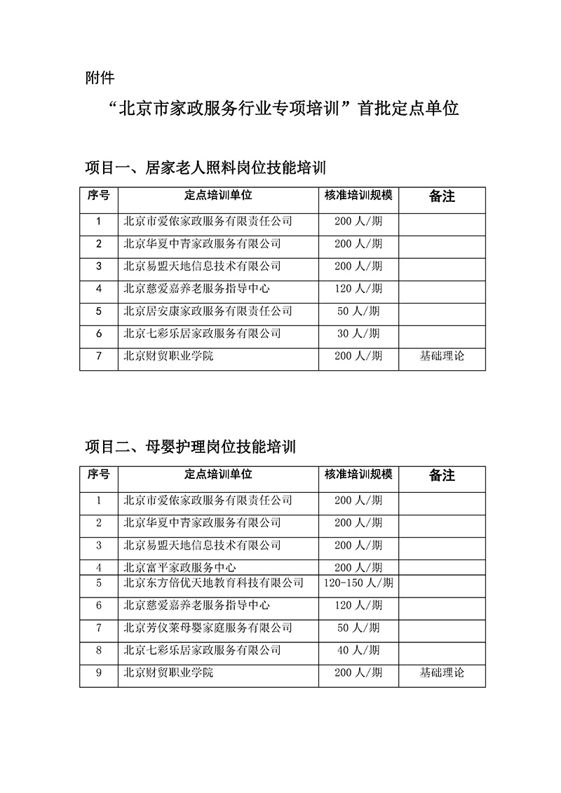 北京家政服务协会专家委员会经材料初审、现场核查、评审,首批认证9个单位为“北京市家政服务行业专项培训”定点培训单位(见附件),现予以公示。 公示期为2015年1月14日至1月16日。若对首批公示单位有异议,请在公示期内通过来函或来电方式进行反映。