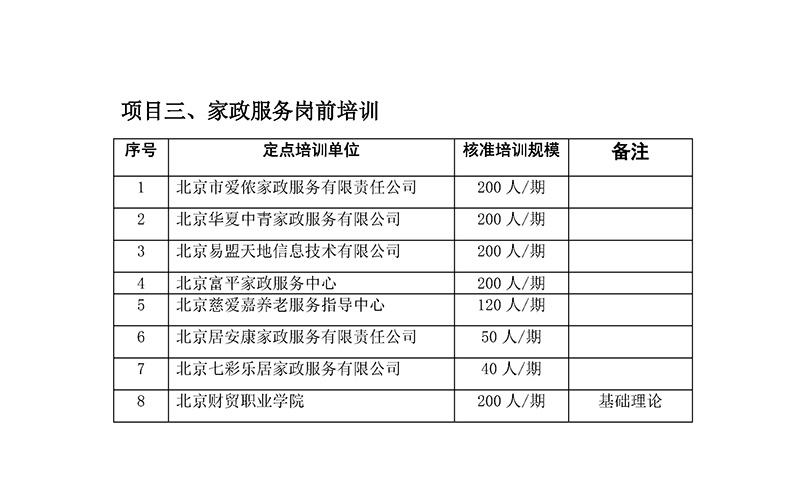为贯彻落实《国务院办公厅关于发展家庭服务业的指导意见》(国办发[2010]43号)文件精神和北京市关于鼓励发展家政服务业的有关意见,适应首都新功能定位对家政服务行业提出的新要求,北京家政服务协会结合本市实际,开展“北京市家政服务行业专项培训”,并于2015年1月7日发布了《关于开展北京市家政服务行业专项培训公告》,截至2015年1月10日,共有45家单位提出申请培训资质。