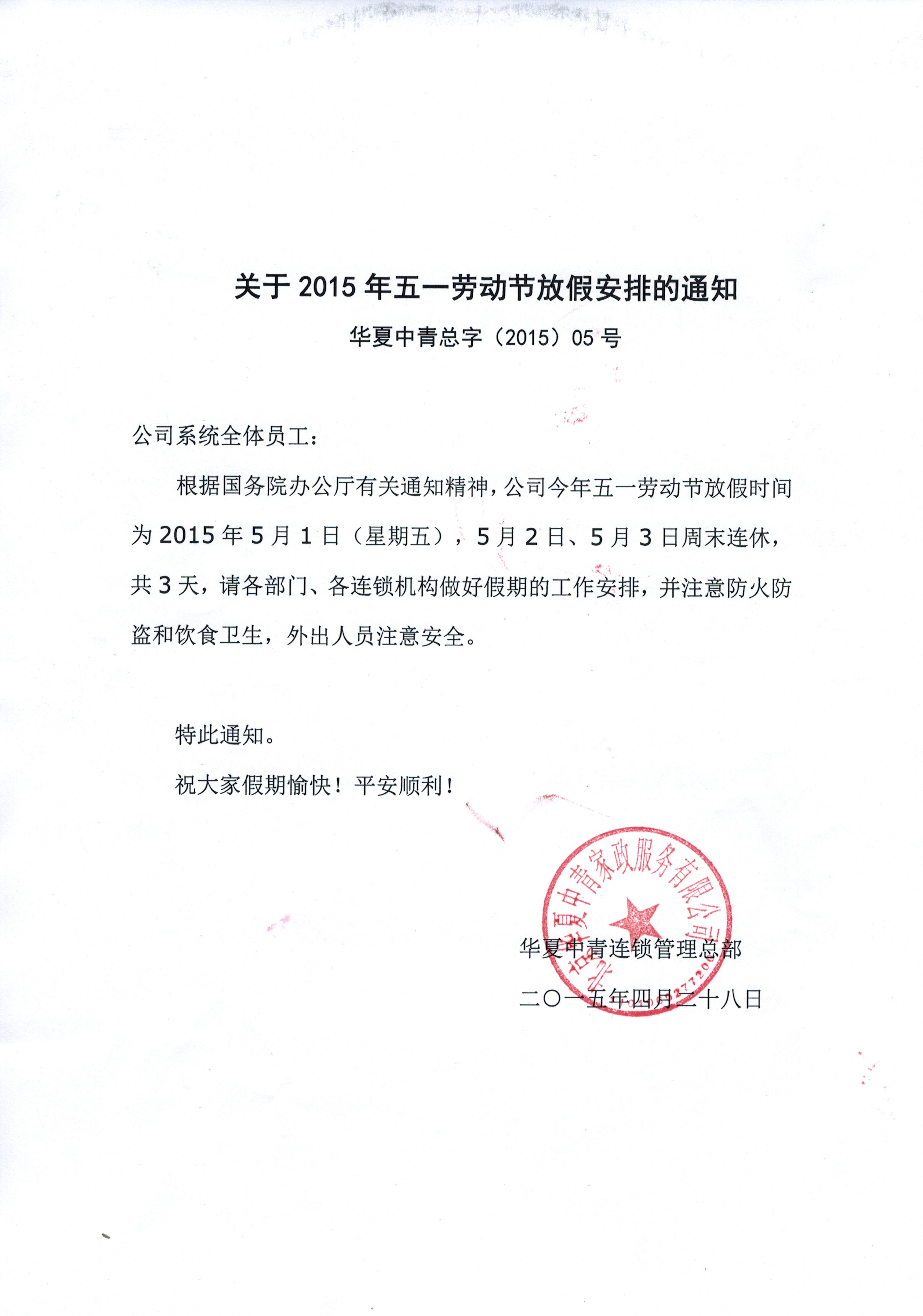 根据国务院办公厅有关通知精神,公司今年五一劳动节放假时间为2015年5月1日(星期五),5月2日、5月3日周末连休,共3天,请各部门、各连锁机构做好假期的工作安排,并注意防火防盗和饮食卫生,外出人员注意安全。