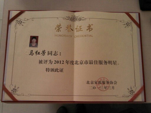 员工马红芳,在华夏中青工作有8年之久,不论是育儿工作还是家政工作,都得心应手。专业技能过硬,服务心态好。客户反馈的口碑良好,2012年度被评为北京市级优秀服务员。