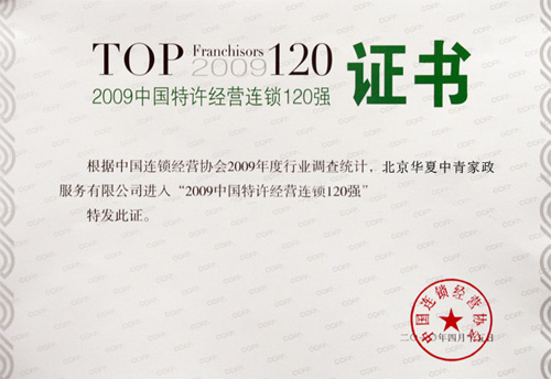 2010年4月15日,第十二届中国特许加盟大会在北京香格里拉饭店如期举行。根据中国连锁经营协会2009年度行业调查统计,2009年中国特许经营连锁120强中,零售、餐饮酒店和服务类企业分别为52家、31家、37家,分布在59个细分业态。相比2008中国特许经营连锁百强,2009年120强新增的20家特许企业,主要集中在零售业和服务业。而华夏中青作为家政服务行业唯一一家参选企业再次成功入围“2009中国特许经营连锁120强”。这是公司继2008年成功入围“中国特许经营连锁百强”之后再次蝉联此项殊荣。