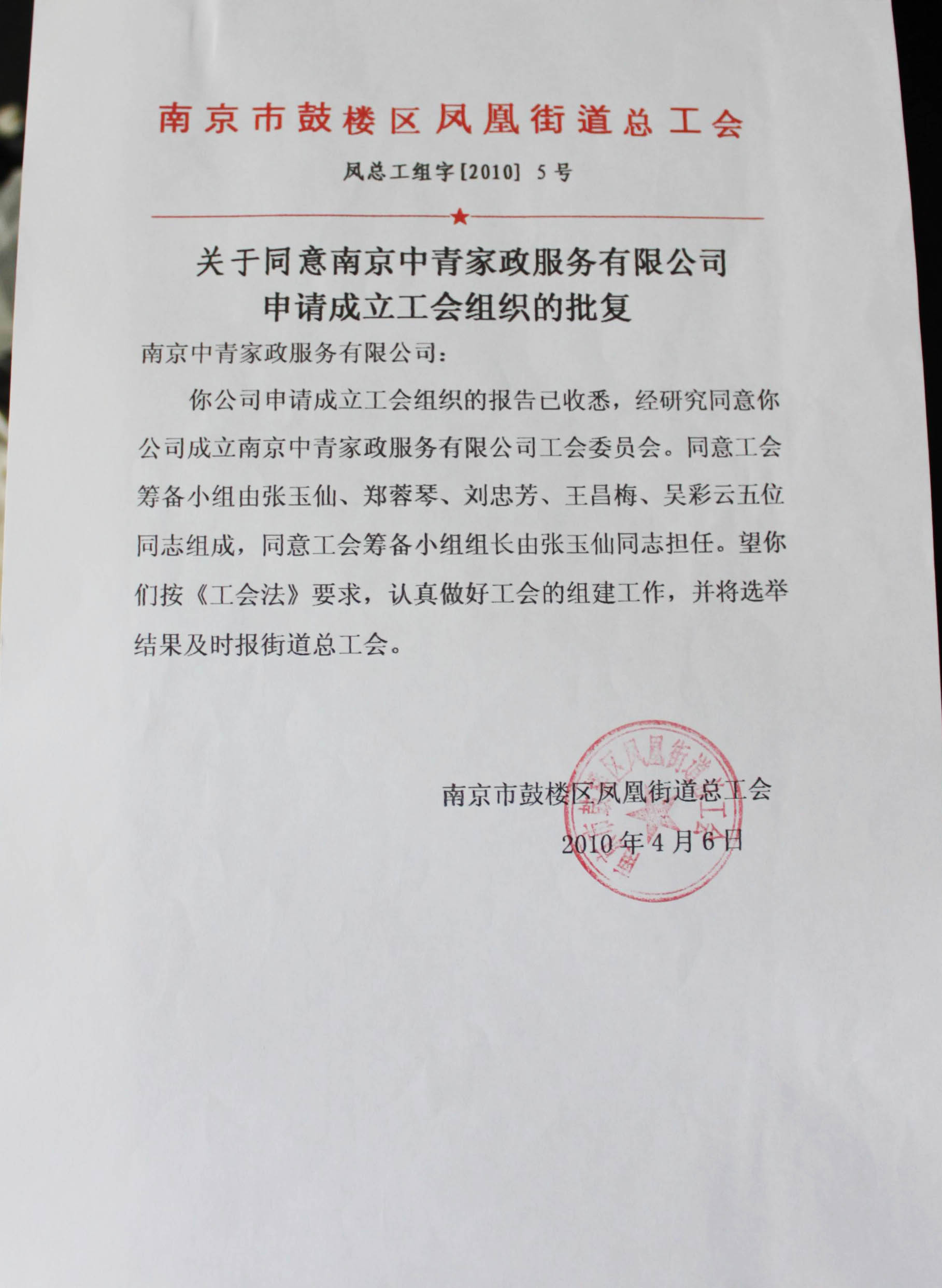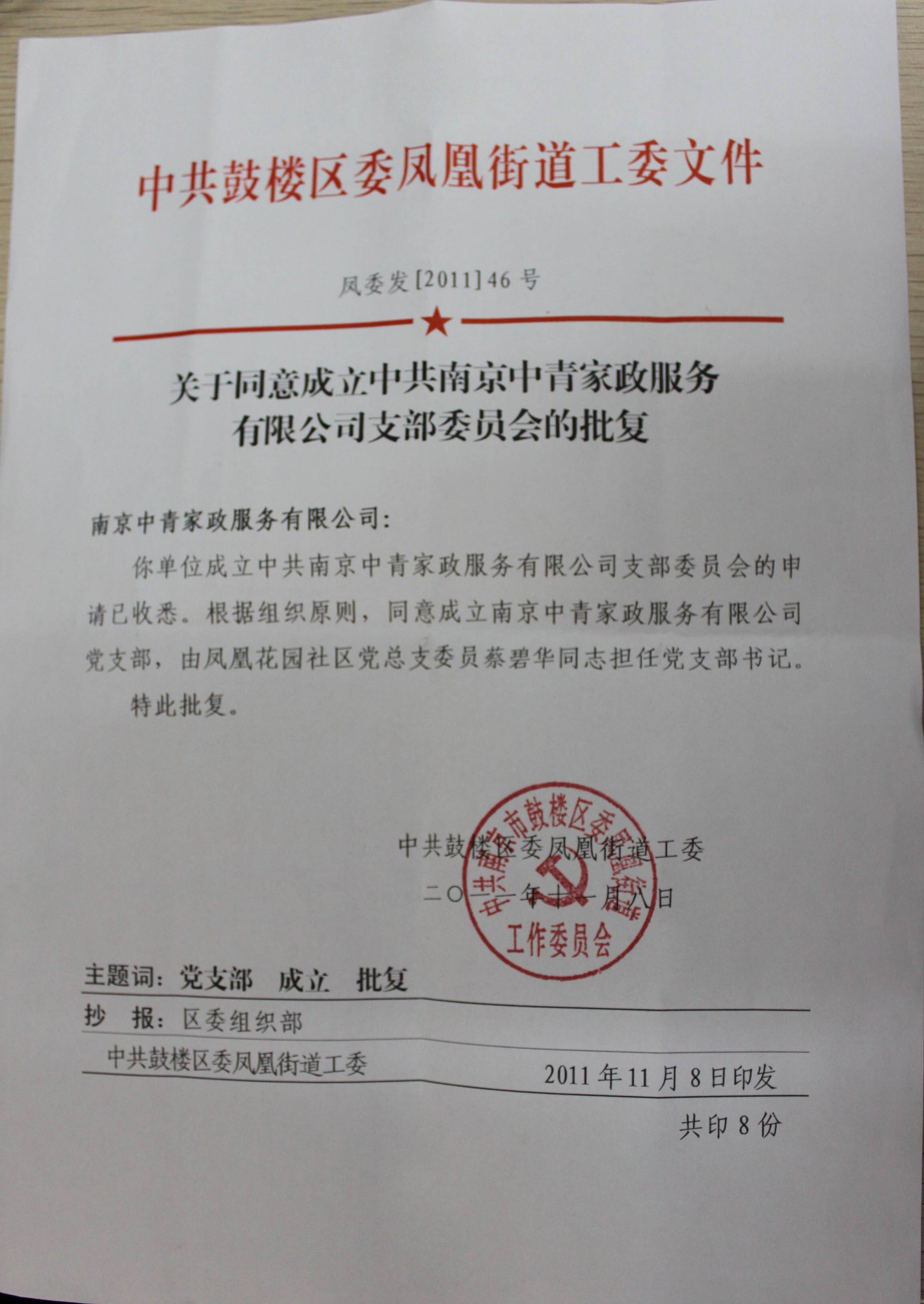 2011年11月8日,中共鼓楼区凤凰街道工委下发了《关于同意成立中共南京中青家政服务有限公司支部委员会的批复》,连同2010年成立的工会组织,说明南京中青的党工组织已经顺利建成,标志着南京中青的组织建设更上了一个新的台阶。