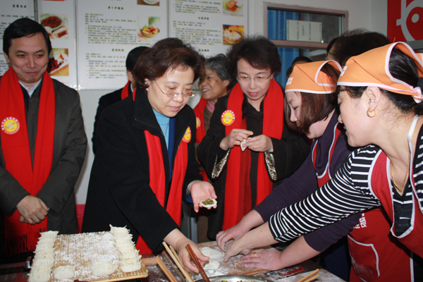 领导与家政员共同包起了小年夜的“团圆饺”。