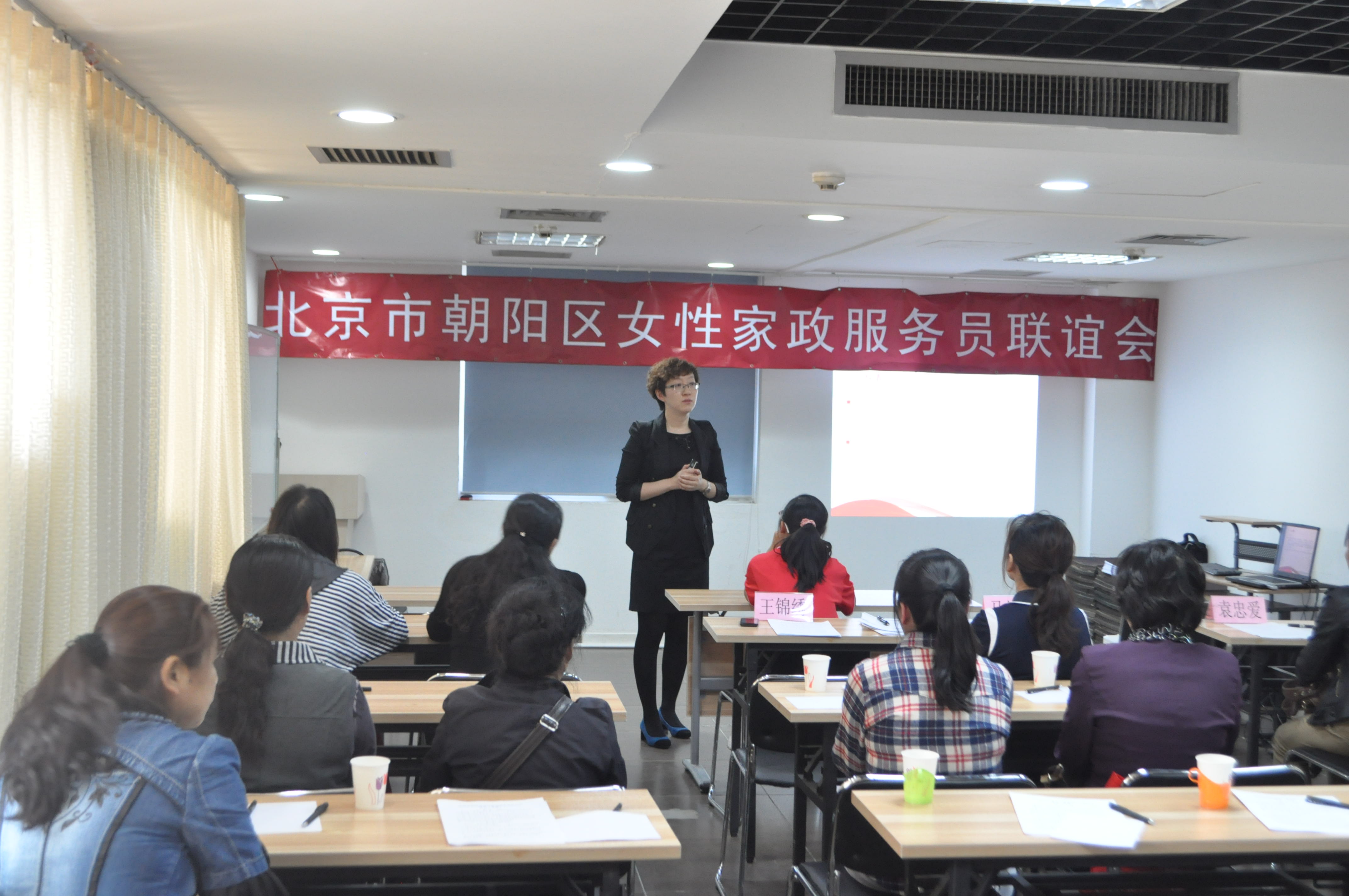 王燕红主任代表妇联作联谊会筹备工作报告,她说:朝阳区女性家政员联谊会的成立为朝阳区的女性家政服务员提供了交流平台,有助于提升家政员的个人综合素质,实现事业、生活双平衡,促进朝阳区家政服务事业的全面发展。