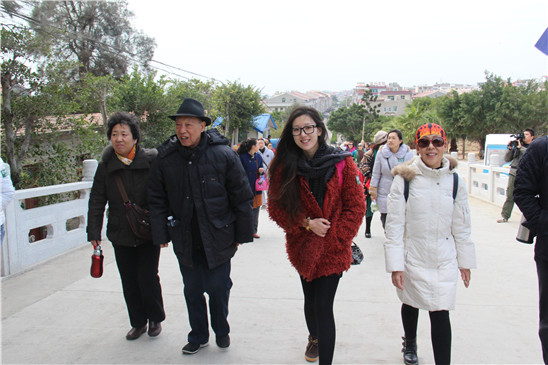祖庙山的山门前,团员们被那层层建筑所震撼,忍不住来了个“全家福“的合影。登323级台阶,过五洞山门、圣旨门、钟鼓楼、太子殿、梳妆楼、升天古迹,团员们在烟蕴缭绕的正殿插上几炷清香,为自己和家人祈福!天后宫妈祖“升天遗迹”石刻拐角有个不足一人高的小石屋,可以容一人侧身观望。这里才是湄洲岛乡亲最早祭拜妈祖的地方。团员们排起长队,等候到小石屋独自与妈祖说句自己内心的悄悄话。过升天楼,进妈祖公园,登上祖庙山顶,看到妈祖身披霞衣,头顶冕冠,慈眉善目,气定神闲,屹立在万绿丛中的山顶。听她的故事,感受了渔岛村姑幻化为女神受万众敬仰的奇迹,这种精神激励着每个团员。