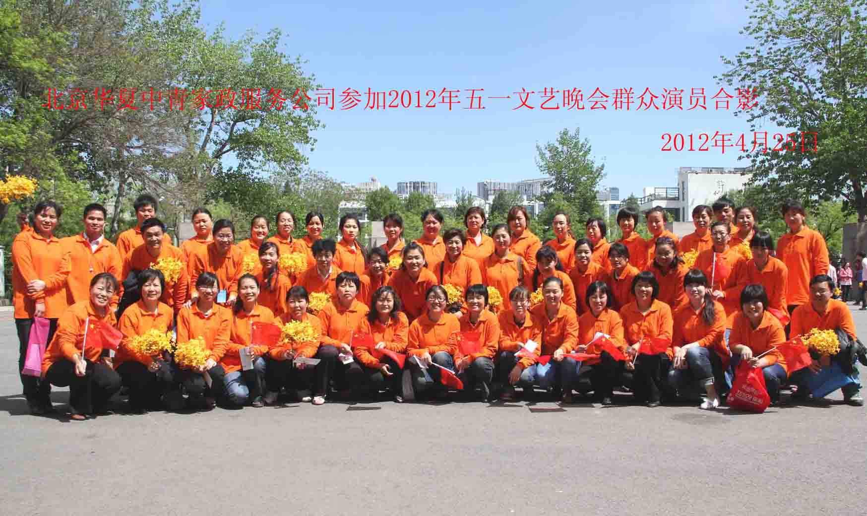 4月24日、 25日由公司员工和家政员代表共53人参加了由全国总工会、中国文联、中央文明办和中央电视台联合举办的《阳光路上》―2012年“五一”国际劳动节大型文艺晚会暨第三届职工艺术节开幕式在北京工人体育馆的彩排及汇演。中共中央政治局委员、全国人大常委会副委员长、中华全国总工会主席王兆国,中共中央政治局委员、书记处书记、中宣部部长刘云山,中共中央政治局委员、书记处书记、中组部部长李源潮,国务委员兼国务院秘书长马凯等党和国家领导人与全国劳模代表,2012年全国五一劳动奖状、奖章代表和全国工人先锋号代表,香港、澳门工会“五一”代表团成员一同观看了演出。我公司员工参与了汇演的合唱、宣誓等环节,在两天的排练中认真、守纪,充分展现了家政服务业的风采。