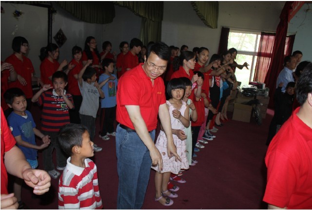 董事长庞大春与带领员工们同小朋友们一起欢唱《朋友》