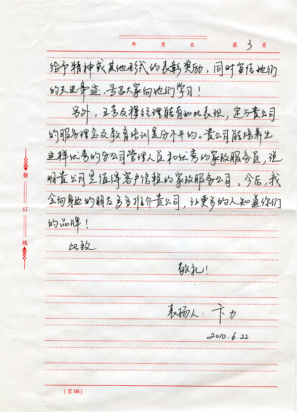 客户卞力致家政员王芳、第二十分公司经理穆德云的感谢信