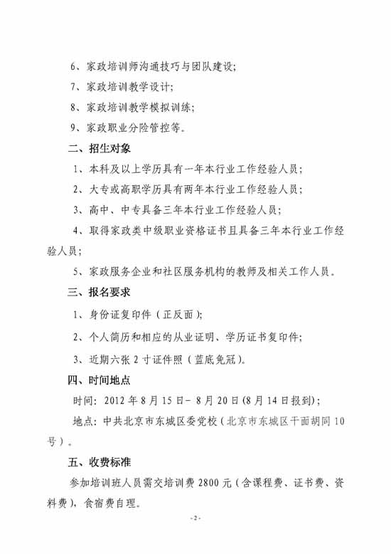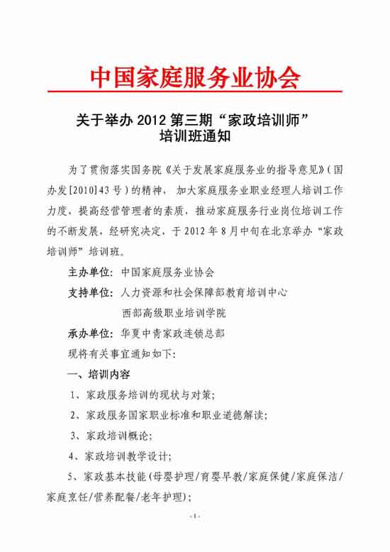 中国家庭服务业协会关于举办2012第三期“家政培训师”培训班通知
